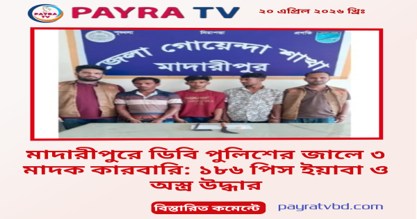 মাদারীপুরে ডিবি পুলিশের জালে ৩ মাদক কারবারি: ১৮৬ পিস ইয়াবা ও অস্ত্র উদ্ধার